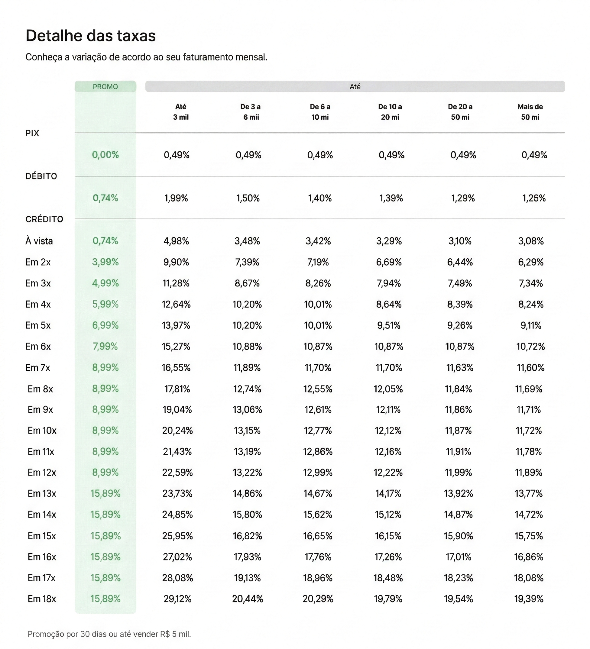 Suas taxas mudam mensalmente. No primeiro dia do mês, é feito o cálculo de qual foi o seu faturamento do mês anterior e qual será a taxa.